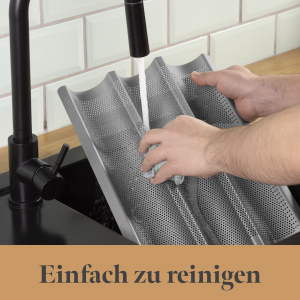 Die Reinigung der GOURMEO Baguette Backform gestaltet sich als besonders einfach: Ein feuchtes, weiches Tuch und etwas Spülmittel genügen, um sie wieder in Top-Zustand zu bringen. Bitte beachten Sie, dass die Backform nicht spülmaschinenfest ist, um die Antihaftbeschichtung nicht zu beschädigen.