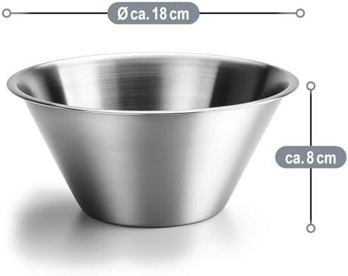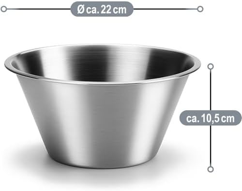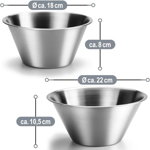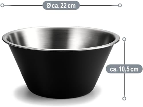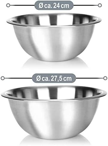 Im Lieferumfang sind eine kleine Schüssel mit einem Durchmesser von ca. 24 cm und einer Höhe von 10,5 cm sowie eine große Schüssel mit einem Durchmesser von ca. 27,5 cm und einer Höhe von 11 cm enthalten. Diese Kombination bietet Ihnen maximale Flexibilität in der Küche.