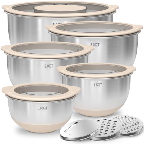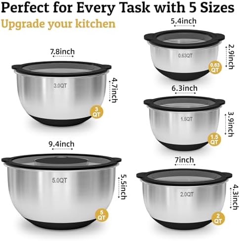 Die dauerhaften laser-markierten Maße (Tassen und Quarts) ermöglichen exakte Portionierung und erleichtern das Messen während des Kochens. Das Set umfasst verschiedene Größen, einschließlich 0,63QT, 1,5QT, 2QT, 3QT und 5QT, sodass Sie für jede Mischung die passende Schüssel zur Hand haben. Darüber hinaus sind die Schüsseln stapelbar und sparen so bis zu 50% Schrankplatz.