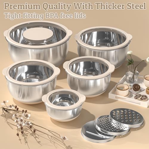 Unser Edelstahl mit einer Dicke von 0,46mm garantiert eine langlebige Nutzung und ist pflegeleicht. Die matte Außenfläche ist resistent gegen Dellen und Rost, während die glatte Innenfläche das Anhaften von klebrigen Lebensmitteln minimiert. Nach dem Gebrauch können Sie die Schüsseln einfach mit Wasser abspülen oder in die Geschirrspülmaschine geben. Ihr elegantes Design macht das Set zudem zu einem perfekten Geschenk für Einweihungsfeiern, Thanksgiving oder Weihnachten.