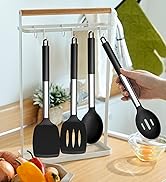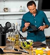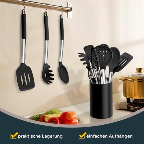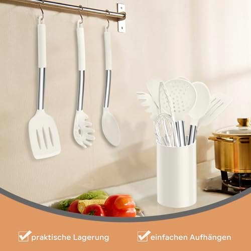 Die glatte, antihaftbeschichtete Oberfläche macht die Reinigung unkompliziert und auch für die Spülmaschine geeignet. Sparen Sie Zeit und Mühe beim Saubermachen! Darüber hinaus ermöglichen kleine Löcher am Ende des Griffs ein einfaches Aufhängen an der Wand. Das Set wird mit einem praktischen Utensilienhalter geliefert, der es Ihnen erlaubt, Ihre Utensilien ordentlich auf der Theke zu platzieren und die Küche aufgeräumt zu halten.