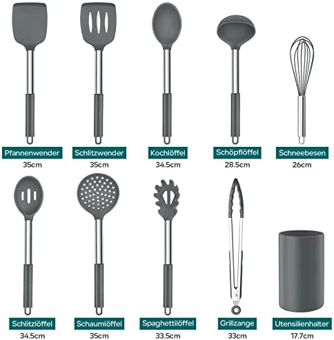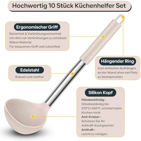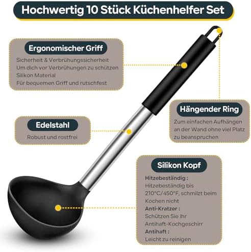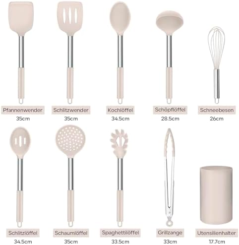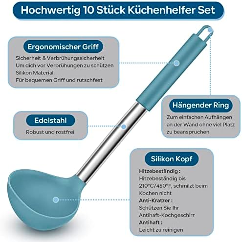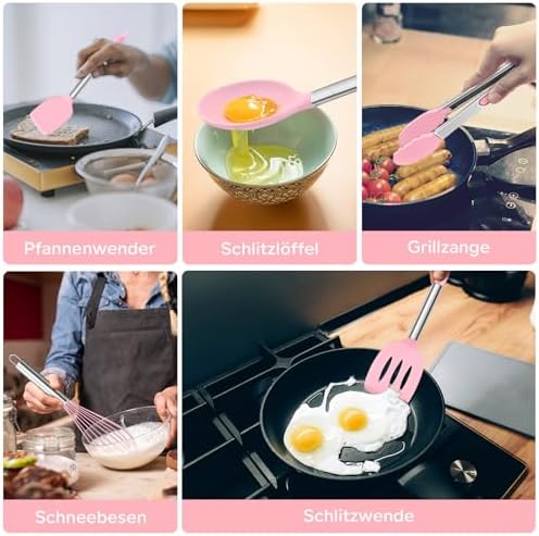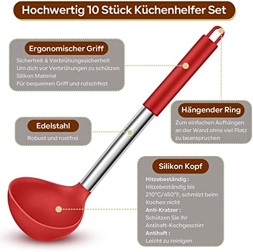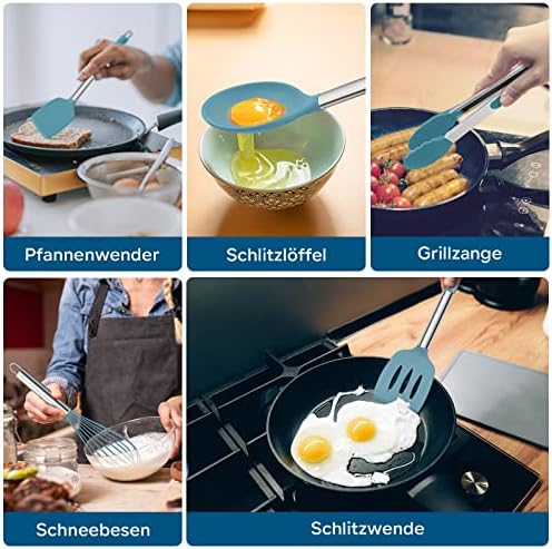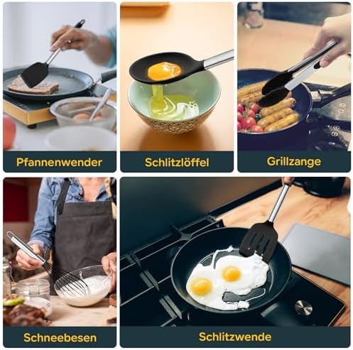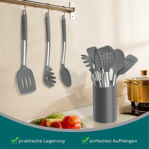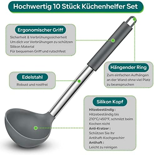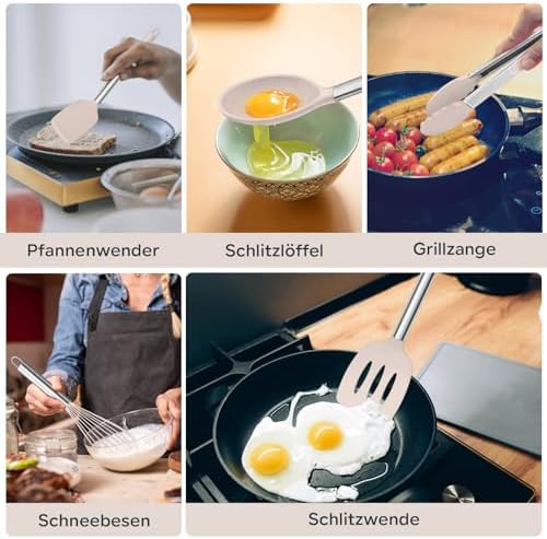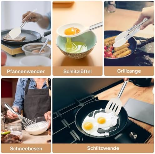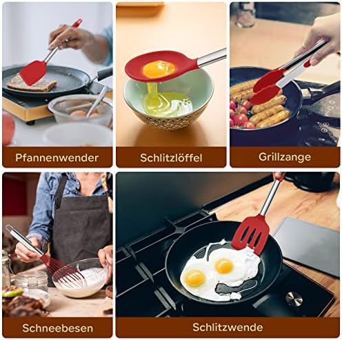 Unsere Küchenutensilien sind so konzipiert, dass sie extrem langlebig sind. Mit einem Silikonkopf, der an einen hochwertigen Edelstahlgriff angebracht ist, bietet dieses Set eine gute Ergonomie und Widerstandsfähigkeit. Im Vergleich zu herkömmlichen Küchenutensilien sind unsere Produkte stabiler, rostfrei und widerstandsfähig gegen Abnutzung, sodass sie Ihnen über Jahre hinweg treue Dienste leisten.