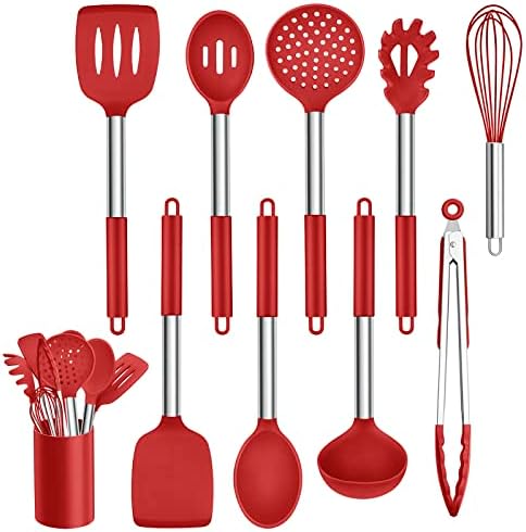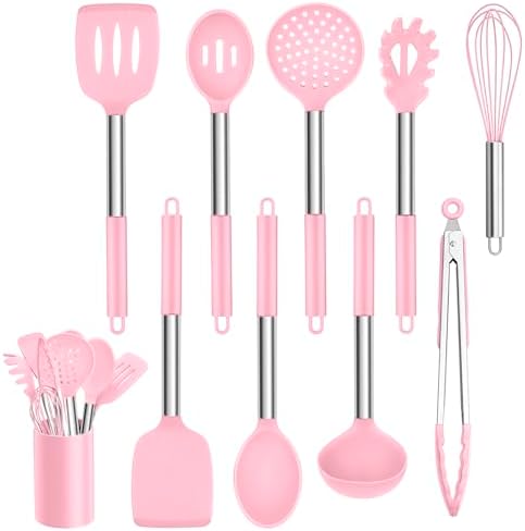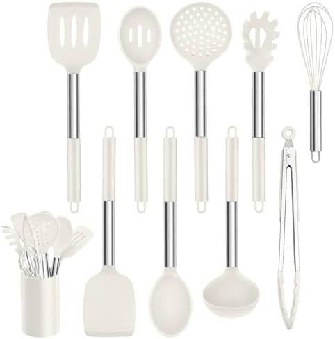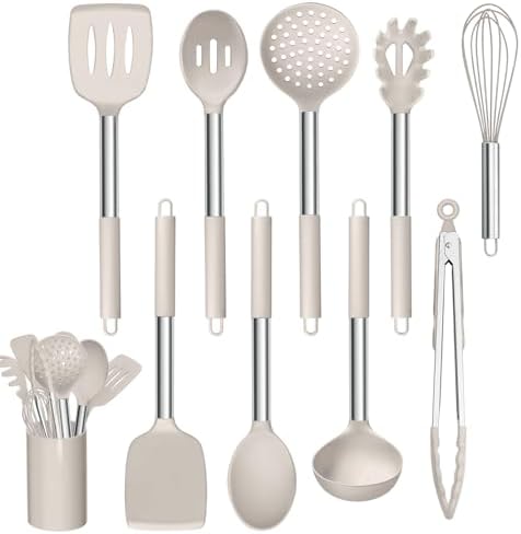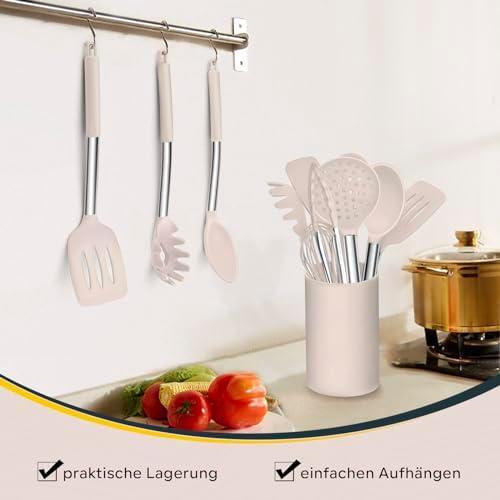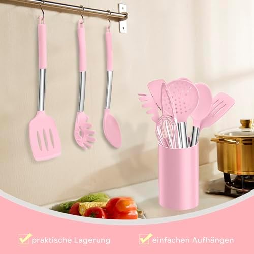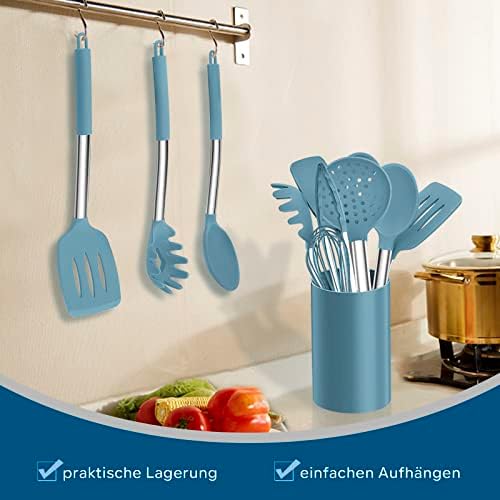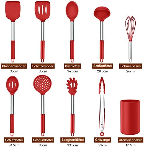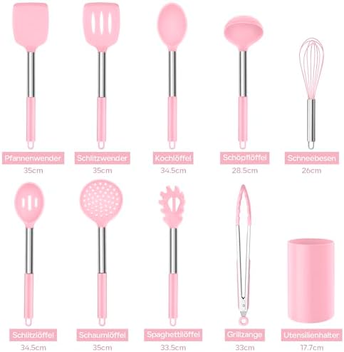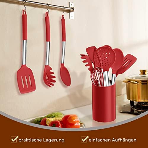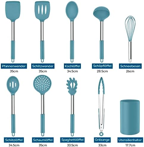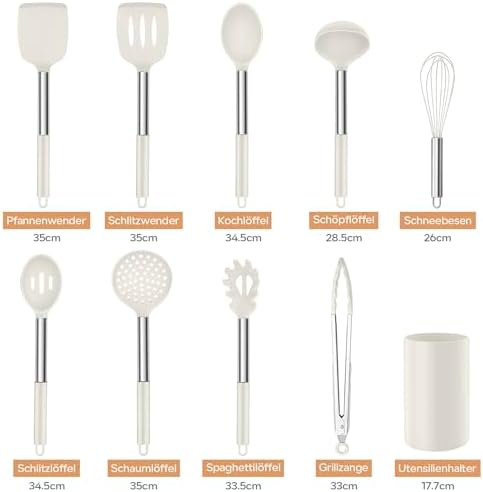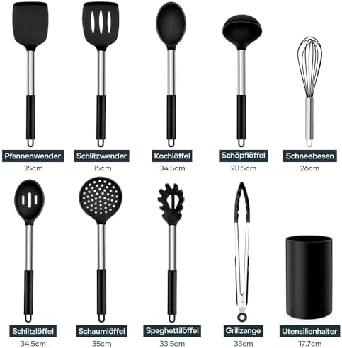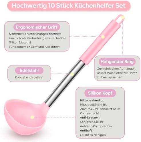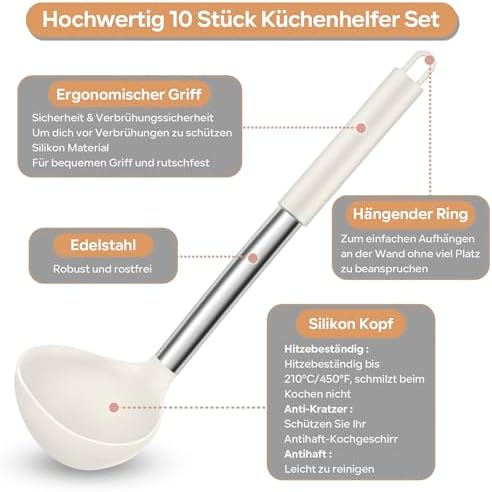 Unsere Küchenutensilien sind so konzipiert, dass sie extrem langlebig sind. Mit einem Silikonkopf, der an einen hochwertigen Edelstahlgriff angebracht ist, bietet dieses Set eine gute Ergonomie und Widerstandsfähigkeit. Im Vergleich zu herkömmlichen Küchenutensilien sind unsere Produkte stabiler, rostfrei und widerstandsfähig gegen Abnutzung, sodass sie Ihnen über Jahre hinweg treue Dienste leisten.