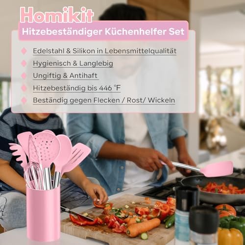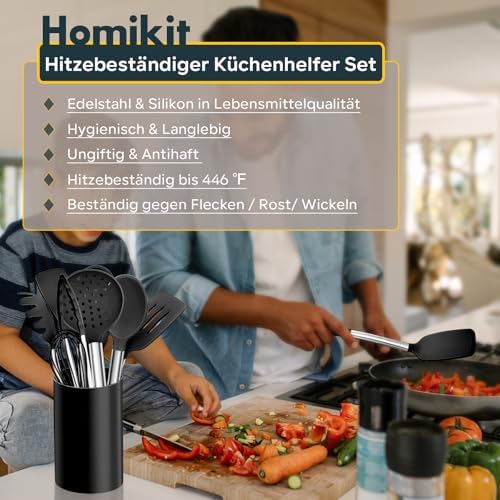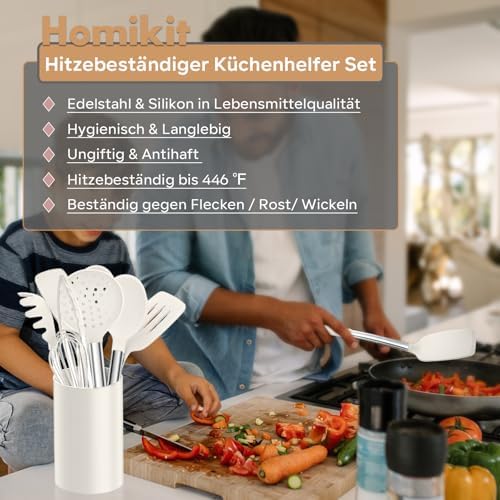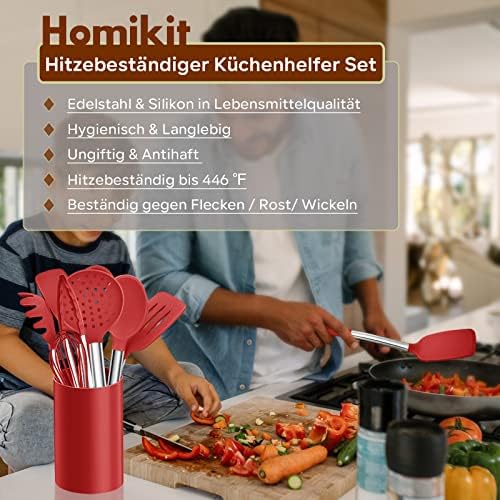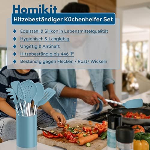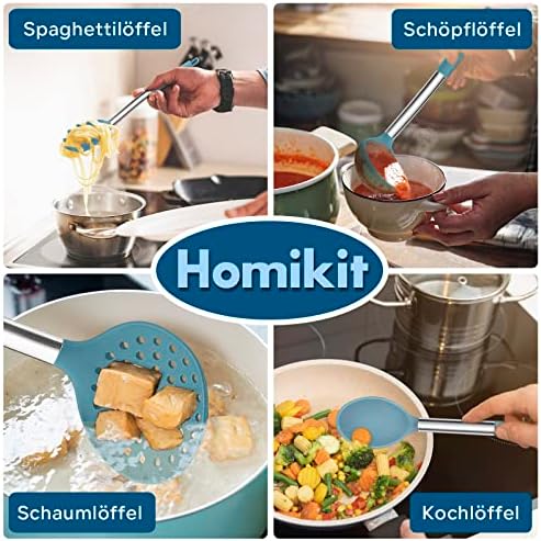 Das Homikit Küchenhelfer Set besteht aus hochwertigem, lebensmittelechtem Silikon und robustem Edelstahl. Dieses Material ist nicht nur hitzebeständig bis zu 230℃ (446℉), sondern garantiert auch, dass keine giftigen Stoffe in Ihre Lebensmittel gelangen. Genießen Sie ein sicheres Kocherlebnis ohne Angst vor Schmelzen oder schädlichen Chemikalien. Rostfrei und gesund, eignet es sich perfekt für den täglichen Gebrauch.