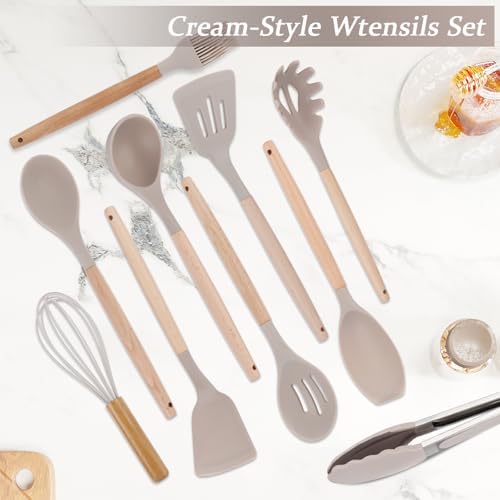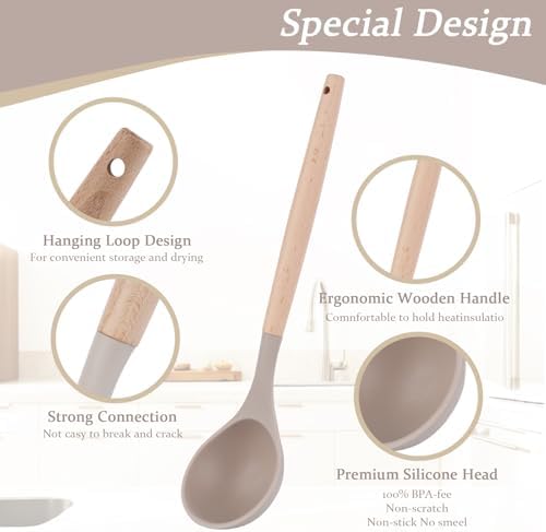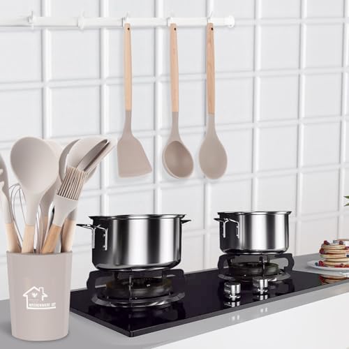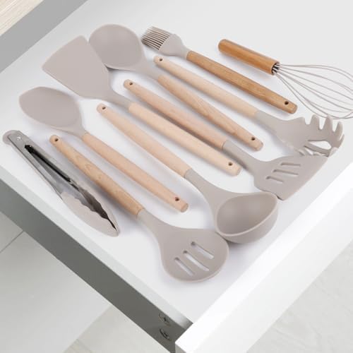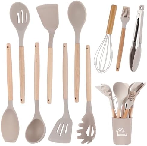 Unser 11-teiliges Küchenutensilien-Set überzeugt durch seine hochwertigen Silikonköpfe, die fest mit einem eleganten Holzgriff verbunden sind. Dieser sorgt nicht nur für eine angenehme Haptik, sondern auch für einen sicheren Halt. Verabschieden Sie sich von Bedenken über Verbiegen oder Verformen – unser Set ist darauf ausgelegt, Ihnen beim Kochen stets zur Seite zu stehen. Zudem schützt der glatte Holzgriff vor Hitzeübertragung und sorgt somit für ein angenehmes Kocherlebnis, ohne dass Ihre Hände übermäßig beansprucht werden.