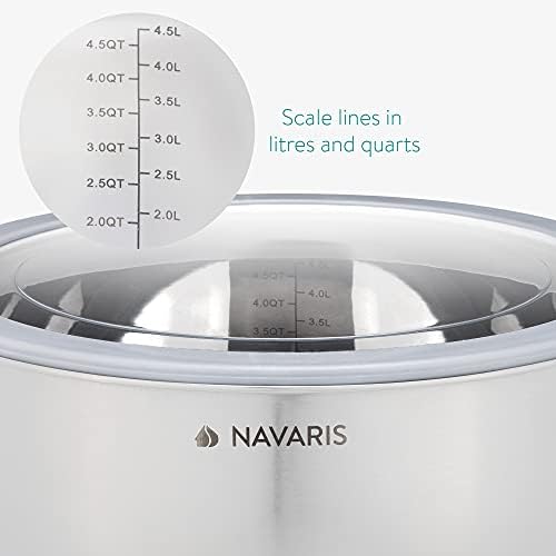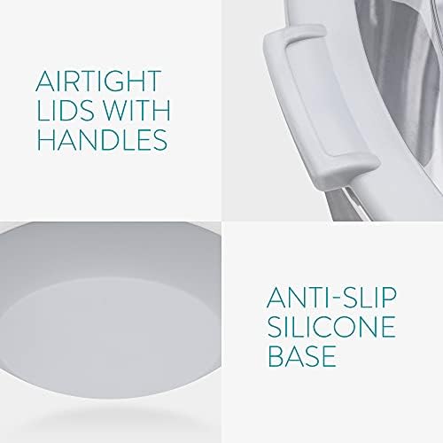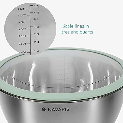 Ein durchsichtiger Deckel mit seitlichen Griffen ermöglicht ein müheloses Öffnen und Schließen der Schüsseln, was besonders beim Kochen einen großen Komfort bietet. Zudem befindet sich in jeder Schüssel eine praktische Messlinie, die sowohl Liter (l) als auch Quart (qt) anzeigt. Dies ist besonders hilfreich, wenn es darum geht, genaue Mengen abzumessen, sei es beim Backen oder beim Kochen.