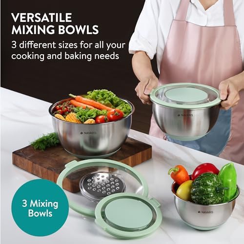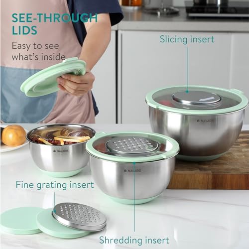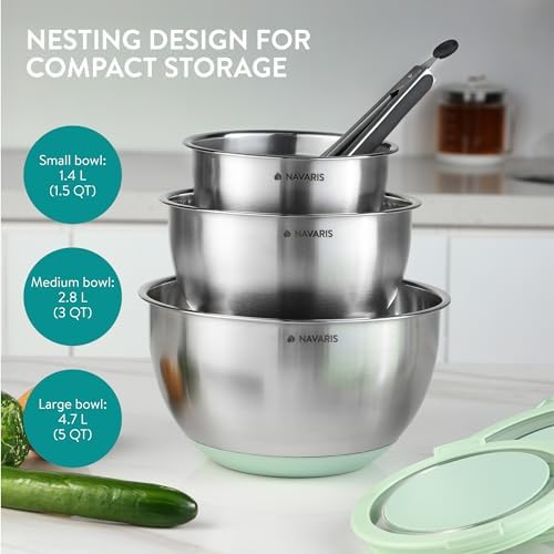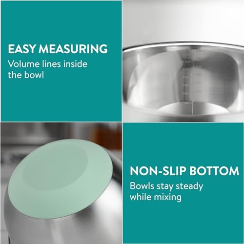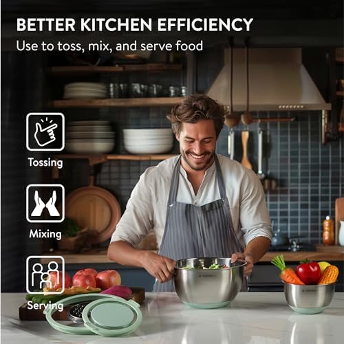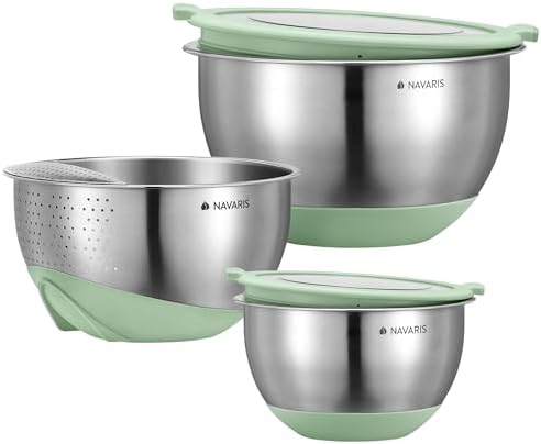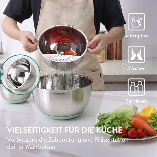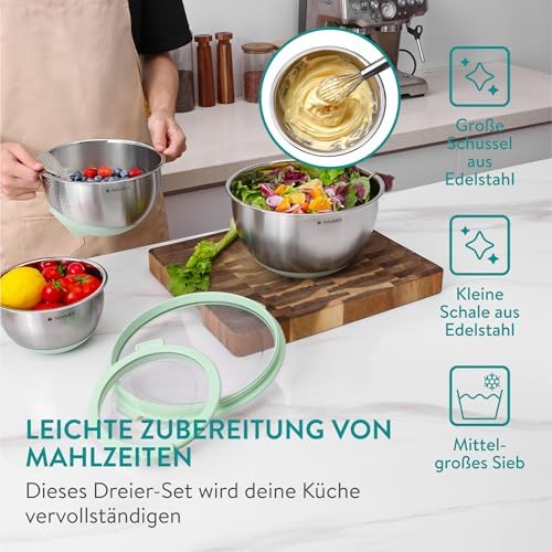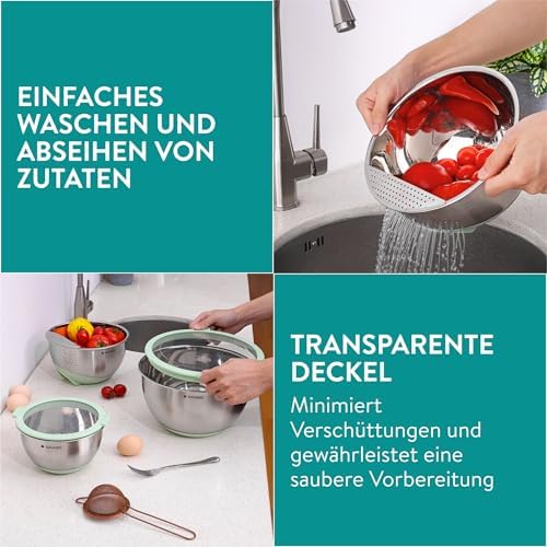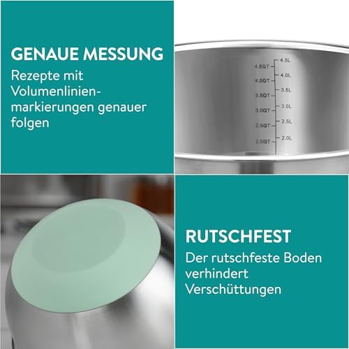 Die Schüsseln bestehen aus hochwertigem Stahl, welcher nicht nur langlebig, sondern auch leicht zu reinigen ist. Der Anti-Rutsch-Silikonboden sorgt dafür, dass die Schüsseln stabil stehen und beim Mischen nicht verrutschen. Diese durchdachten Design-Details garantieren ein angenehmes und sicheres Kocherlebnis.