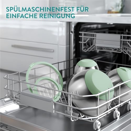 Nach dem Gebrauch können die Rührschüsseln bequem in der Spülmaschine gereinigt werden. Der Deckel sollte allerdings vorsichtig per Hand gereinigt werden, um seine Langlebigkeit zu gewährleisten. Dank dieser einfachen Pflege sind die Schüsseln immer bereit für den nächsten Einsatz in Ihrer Küche.