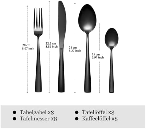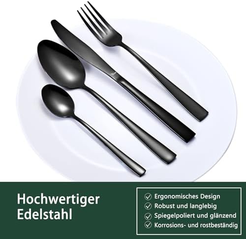 Dieses schwarze Besteckset ist die perfekte Wahl für alle, die Stil und Funktionalität schätzen. Verwöhnen Sie Ihre Gäste mit einem exquisiten Esserlebnis und investieren Sie in Qualität, die Ihnen lange Freude bereitet. Warten Sie nicht länger, und gestalten Sie Ihr Dinner unvergesslich!