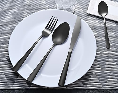 • Elegantes Design: Stilvolles Besteckset in modernem Schwarz mit mattierter Oberfläche und spiegelpolierten Akzenten – ein echter Blickfang für jeden Tisch.