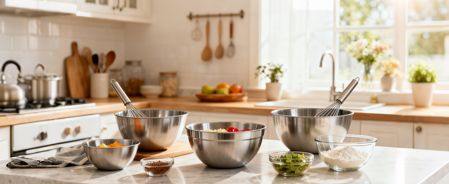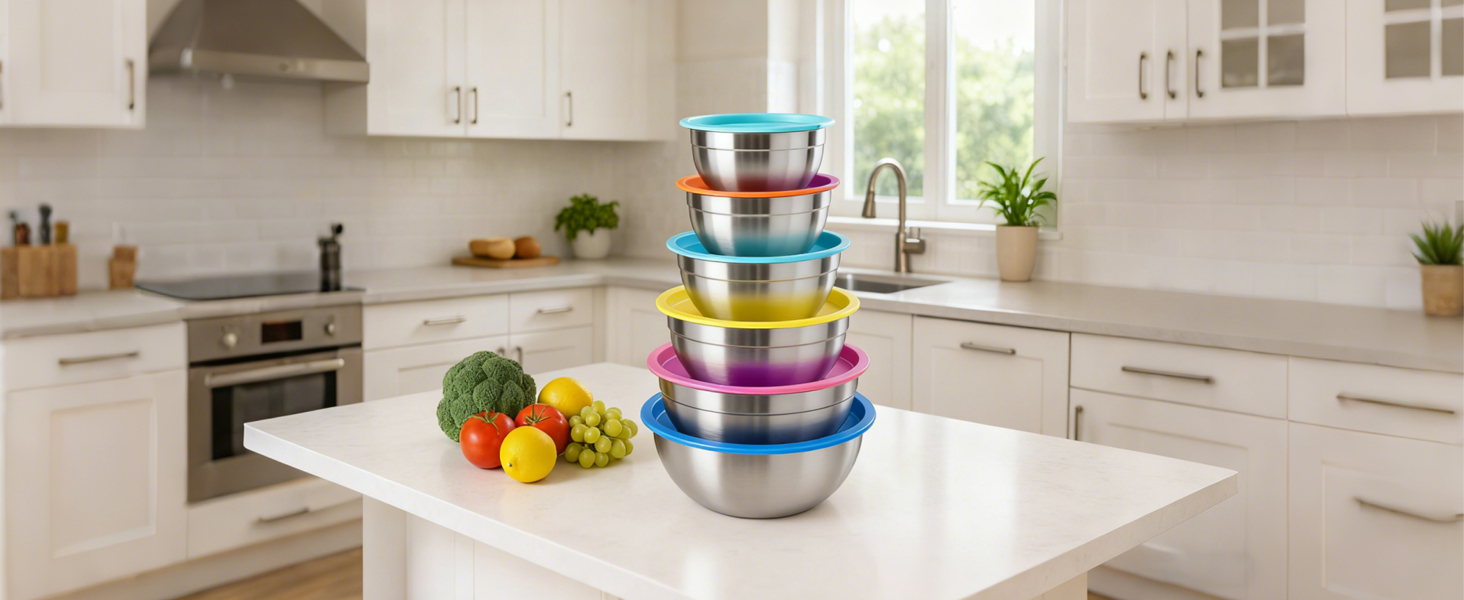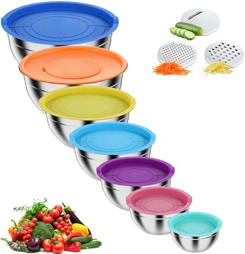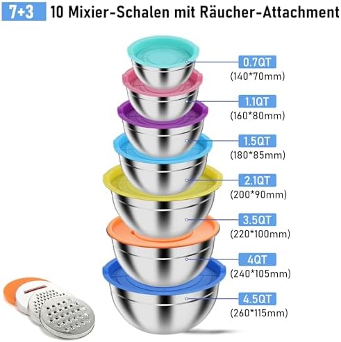 Pleafind 7-teiliges Rührschüssel-Set aus Edelstahl – Stapelbare Schalen mit Deckel & 3 Reibeaufsätzen für jede Küche