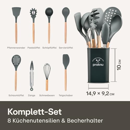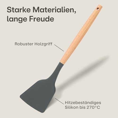 Unser 8-teiliges Küchenhelfer-Set besteht aus hitzebeständigem Silikon, das Temperaturen von bis zu 270°C standhält, und einem robusten Holzgriff. Diese Kombination sorgt nicht nur für eine ansprechende Optik, sondern auch für besonders gute Wärmeisolierung. Im Gegensatz zu Metallgriffen wird der Holzgriff nicht heiß, was das Kochen und Backen noch sicherer macht.