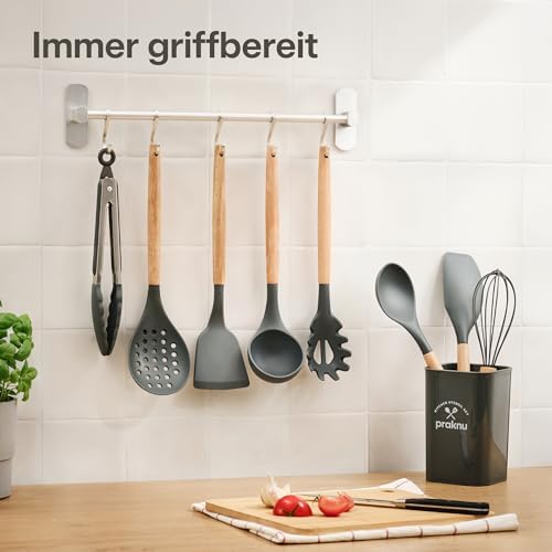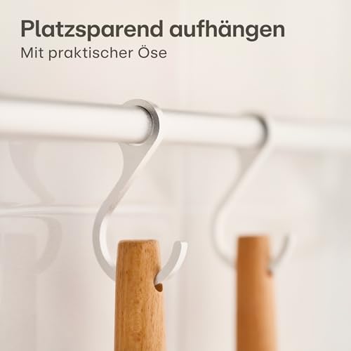Das Küchenhelfer-Set wird mit einer passenden Aufbewahrungsbox geliefert, sodass du deine Utensilien übersichtlich und platzsparend verstauen kannst. Alternativ kannst du die praktischen Ösen der Küchenhelfer nutzen, um sie an der Praknu-Küchenleiste (separat erhältlich) zu platzieren. So hast du stets alles griffbereit.