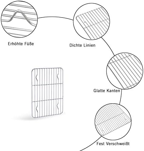 Das im Set enthaltene Auskühlgitter ist mit eng verschweißten parallelen Linien ausgestattet, die für Stabilität und Langlebigkeit sorgen. Die 4 erhöhten Füße (2 cm) ermöglichen eine optimale Luftzirkulation von allen Seiten der Lebensmittel, was die Abkühlzeiten erheblich verkürzt. Die durchdachte Abmessung der Gitterlinien (1,5 x 1,5 cm) verhindert zudem, dass Lebensmittel durch die Lücken fallen, sodass auch kleine Gebäckstücke sicher abgekühlt werden können.