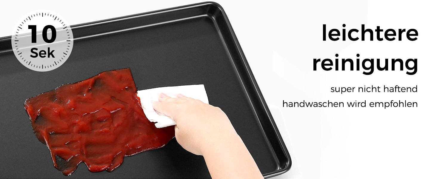 Die Nichthaft-Oberflächen machen das Reinigen der Backbleche zum Kinderspiel. Wir empfehlen eine Handwäsche, um die Langlebigkeit und die optimale Beschichtung zu erhalten. Die stabilen, glatten Kanten und der ovale Formfaktor mit hohen Seiten sorgen zusätzlich für eine komfortable Handhabung und eine hohe Stabilität beim Backen.