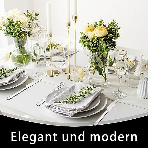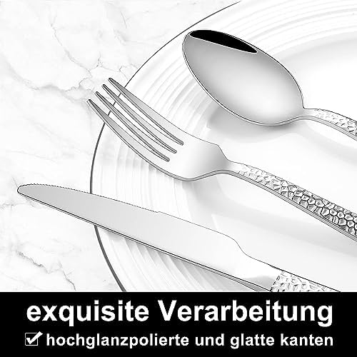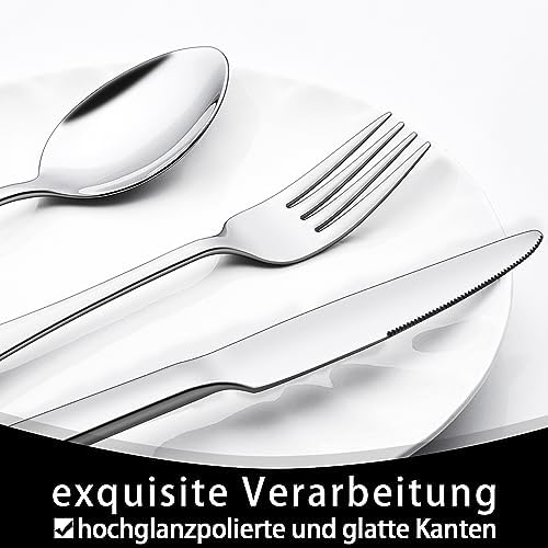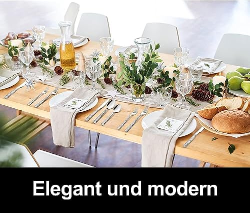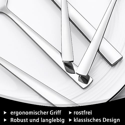 Das elegante Design des Bestecksets besticht durch glatte Kanten und eine klassische Form. Ihre Nutzerfreundlichkeit steht an erster Stelle – keine scharfen Kanten oder rauen Stellen an den Messern, Gabeln und Löffeln. Die besonders scharfen Klingen unserer Tafelmesser und Steakmesser garantieren ein müheloses Schneiden, während der ergonomische Griff für optimalen Komfort sorgt.