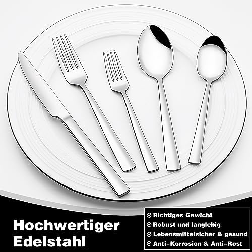 Unser Besteckset besteht aus 100% lebensmittelechtem Edelstahl. Dieser hochwertige, korrosionsbeständige und rostfreier Stahl sorgt nicht nur für eine lange Lebensdauer, sondern auch dafür, dass keine Rückstände oder unangenehme Gerüche zurückbleiben. Sie können sich darauf verlassen, dass unser Besteckset robust ist und auch nach häufigem Gebrauch seine Form behält.