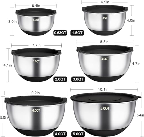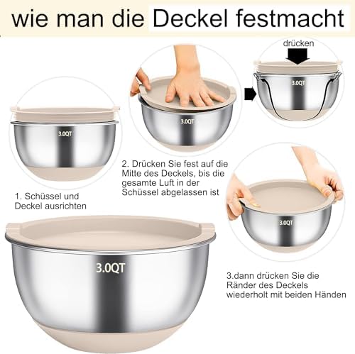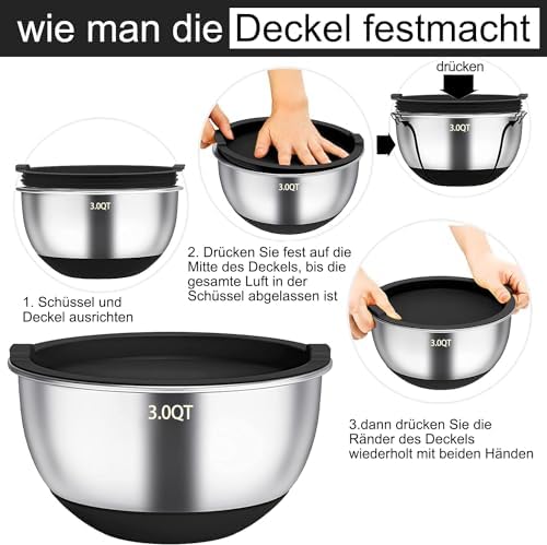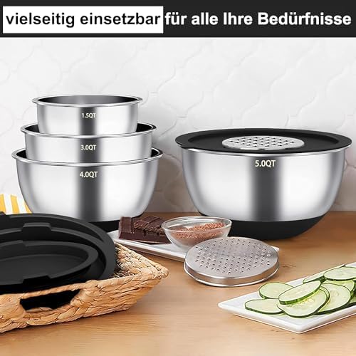 Die innovativen Silikonböden sorgen dafür, dass die Schüsseln beim Mischen und Schlagen nicht verrutschen. So können Sie sich voll und ganz auf das Kochen konzentrieren, ohne Angst zu haben, dass etwas schiefgeht. Darüber hinaus sind die Messskalen in Quarts und Litern klar eingraviert, sodass Sie die Zutaten genau abmessen können.