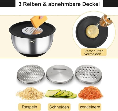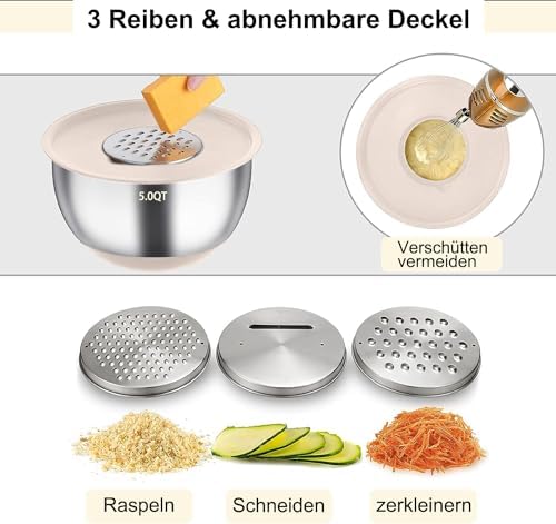 Dieses Set ist nicht nur zum Mischen gedacht. Der Deckel der 5 QT Schüssel verfügt über eine abnehmbare Mitte, in die eine von drei kostenlosen Reiben eingesetzt werden kann. So können Sie ganz einfach frische Zutaten reiben und Ihre Gerichte verfeinern. Das Set beinhaltet auch eine Heftbürste, einen Spreizspatel, einen flexiblen Spatel, einen Schneebesen, einen Eierseparator, eine Zange und 6 Messlöffel, die Ihre Koch- und Backerlebnisse noch einfacher machen.
