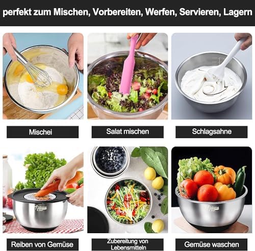 Ein zusätzliches Plus ist das Nesting-Design der Schüsseln. Diese lassen sich ineinander stapeln, was wertvollen Platz in Ihren Küchenschränken spart. Sie passen perfekt in Kühlschrankregale und Vorratsschränke in Standardgröße, und helfen Ihnen, Ihre Küche ordentlich und aufgeräumt zu halten.