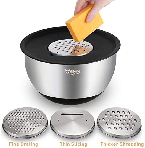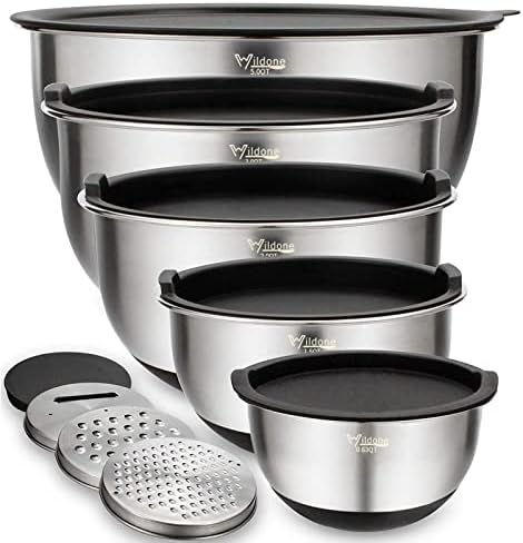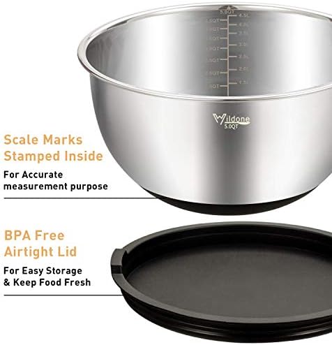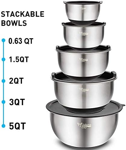 Das Wildone Rührschüsseln Set bietet Ihnen fünf hochwertige Schalen in verschiedenen Größen (5QT, 3QT, 2QT, 1,5QT und 0,63QT), ideal zum Messen, Mischen, Servieren und Lagern von Lebensmitteln. Egal, ob Sie eine kleine Menge Dips oder einen großen Salat zubereiten möchten, dieses Set hat für jede Gelegenheit die passende Größe.